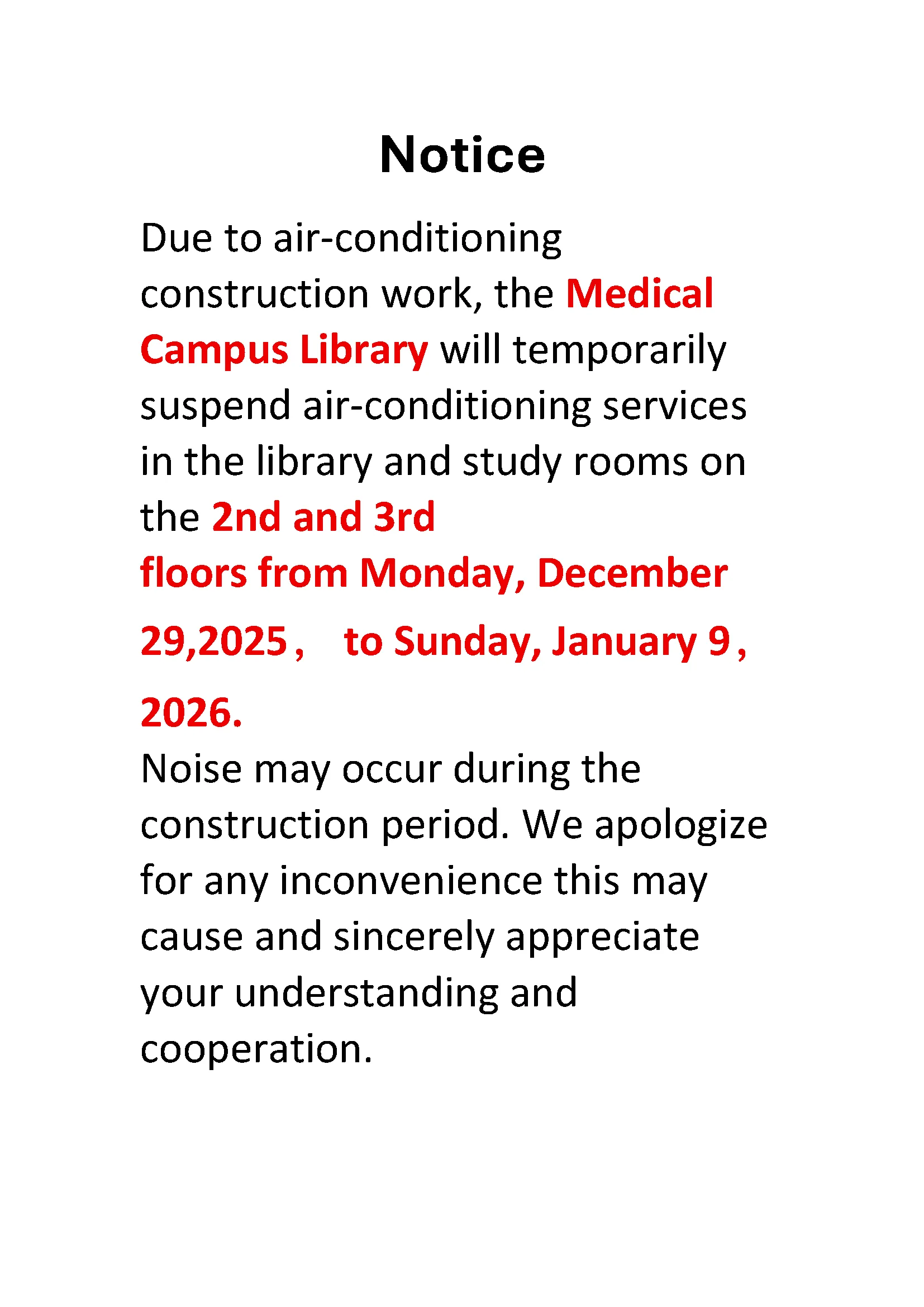 Due to air-conditioning construction work, the Medical Campus Library will temporarily suspend air-conditioning services in the library and study rooms on the 2nd and 3rd floors from Monday, December 29,2025﹐ to Sunday, January 9﹐2026. Noise may occur during the construction period. We apologize for any inconvenience this may cause and sincerely appreciate your understanding and cooperation.