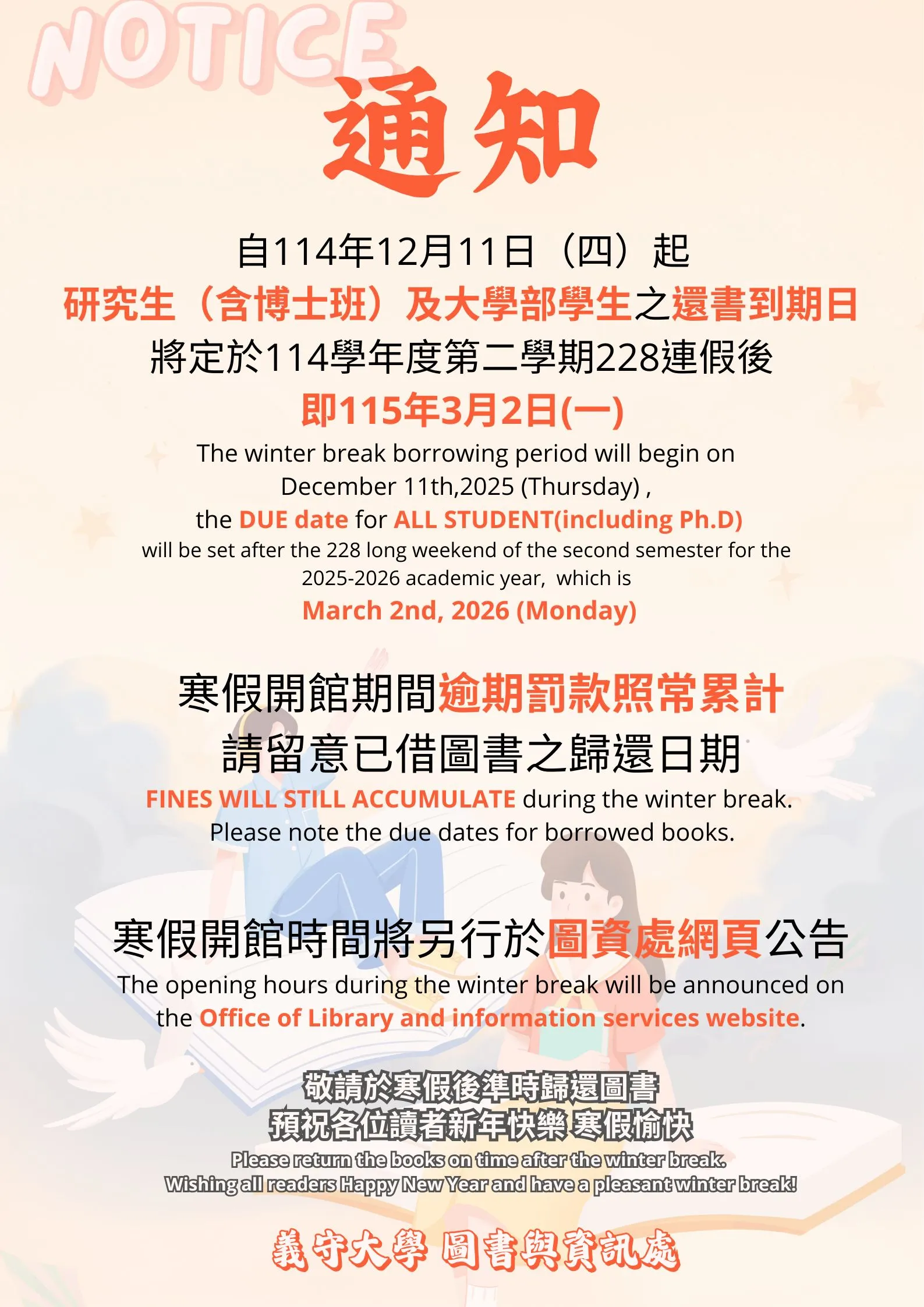 1.For Graduate and Undergraduate Students (including Ph.D. candidates): Books borrowed starting from Thursday, Dec 11, 2025, will be due on Monday, Mar 2nd, 2026.