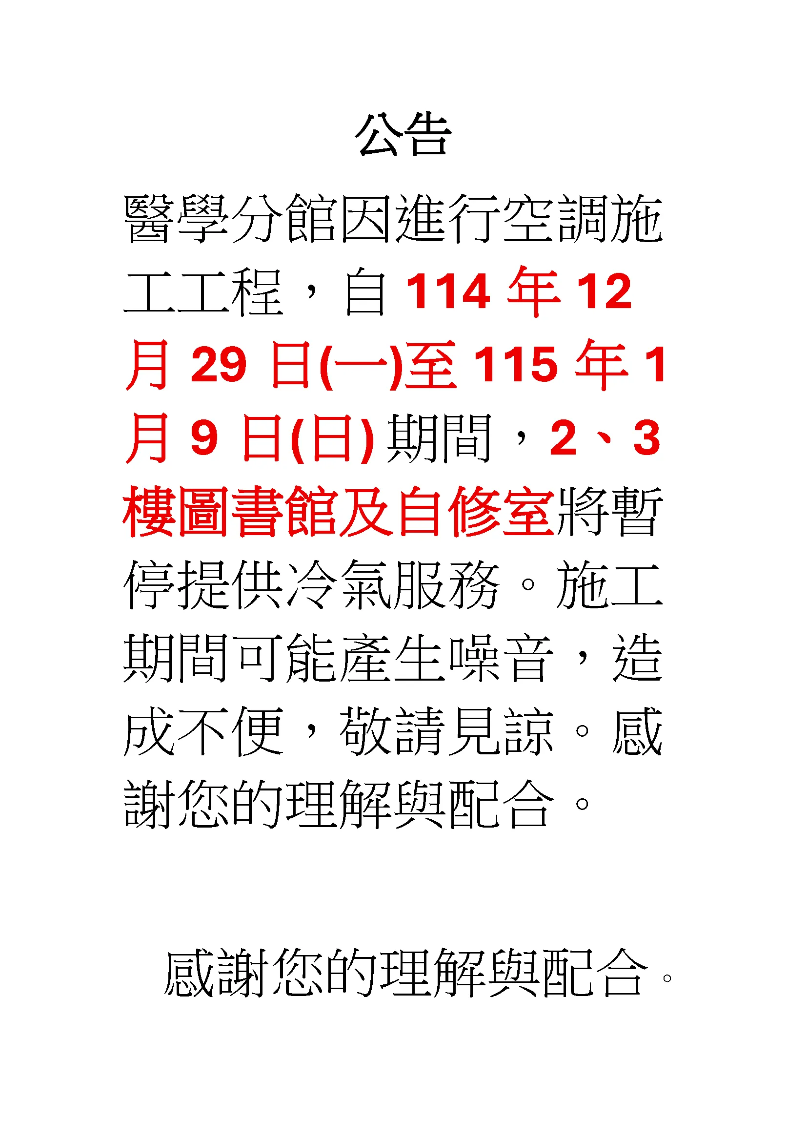 暫停提供冷氣服務醫學分館因進行空調施工工程,自 114年12月29日(一)至115年1月9日(日) 期間,2、3樓圖書館及自修室將暫停提供冷氣服務。施工期間可能產生噪音,造成不便,敬請見諒。感謝您的理解與配合。