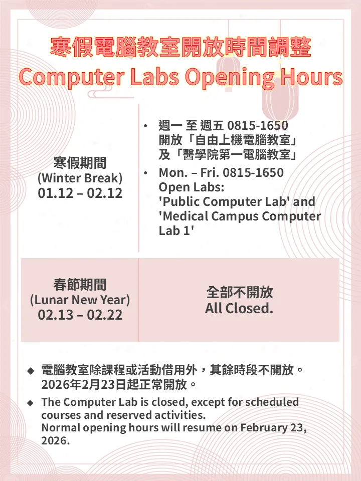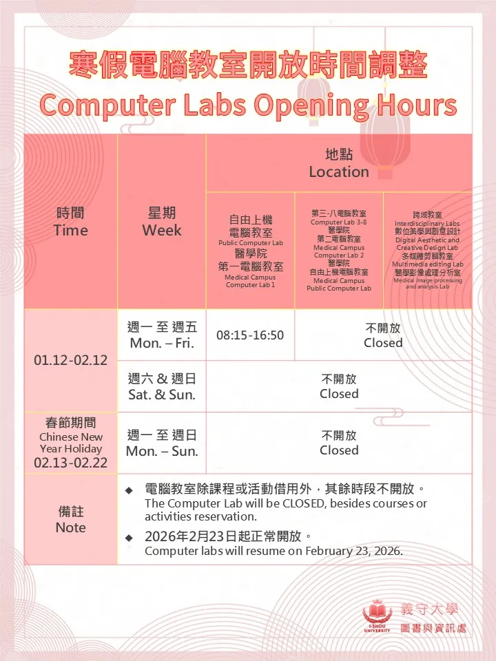 📢114學年寒假電腦教室開放時間