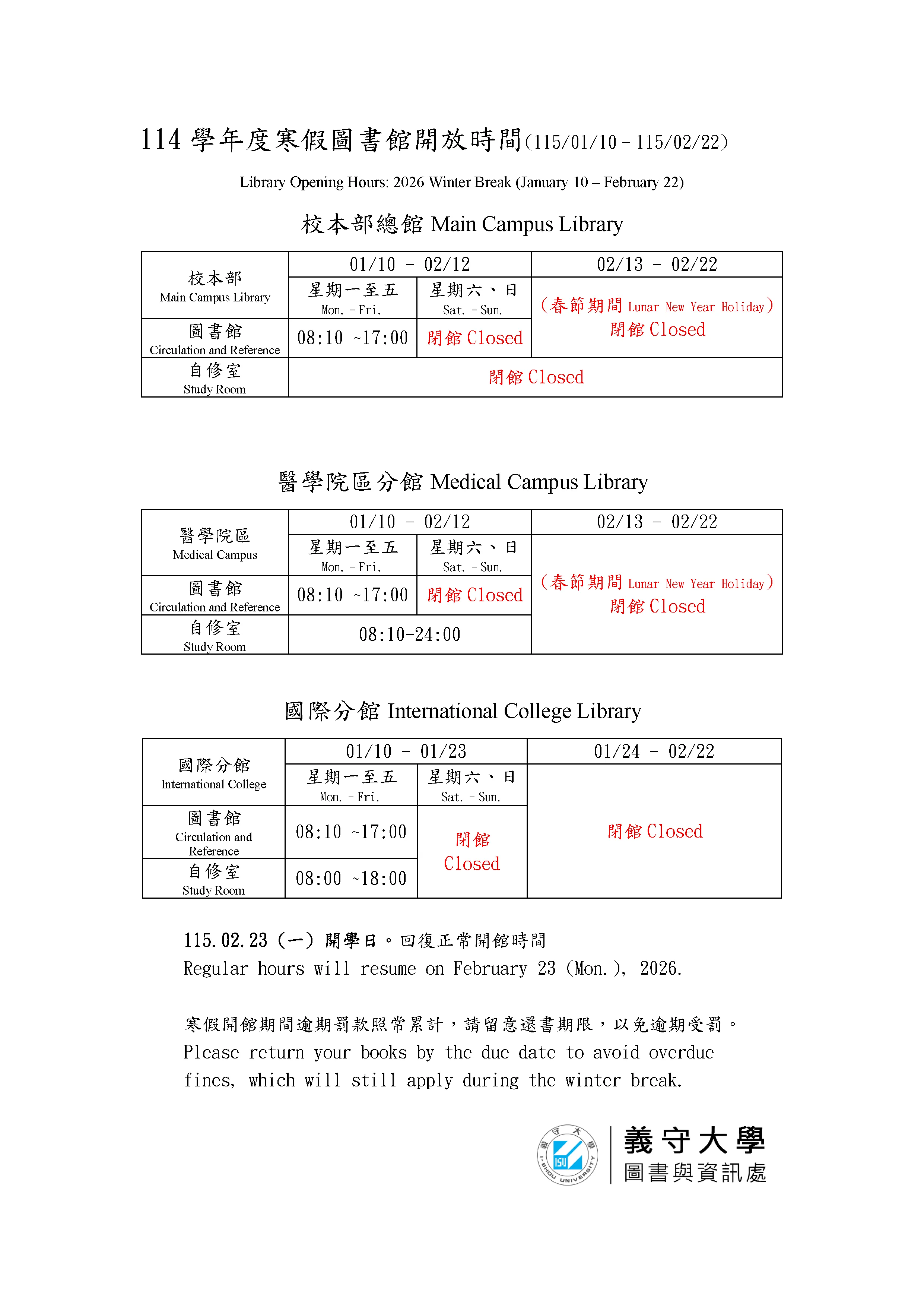 114 學年度寒假圖書館開放時間 (115/01/10 – 115/02/22) Library Opening Hours: 2026 Winter Break (January 10 – February 22)