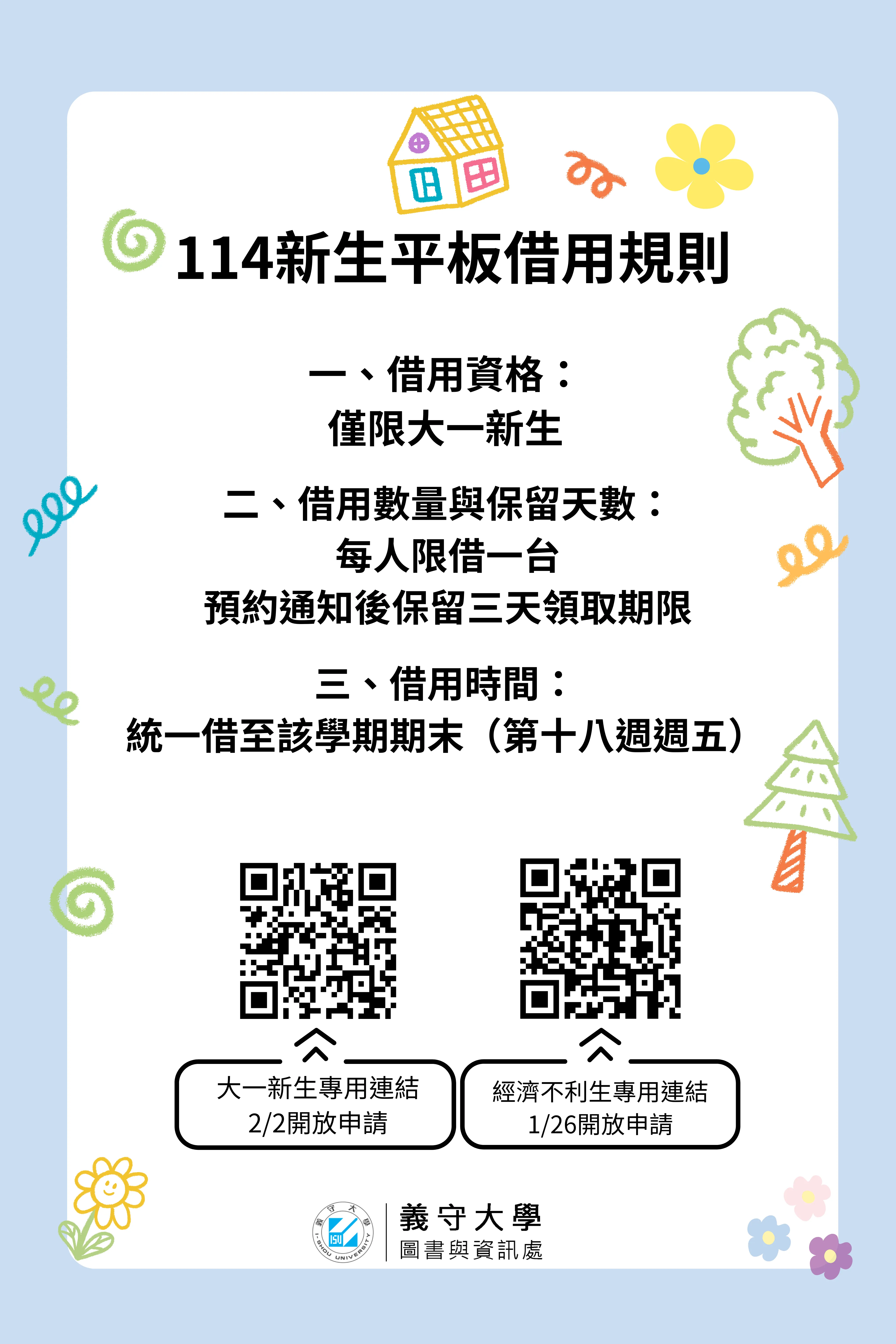 本館於114學年度第二學期備有平板電腦共209台,提供大一新生借用。申請資格以學號為準,如有借用需求,請依下列時程填寫對應表單提出申請:
