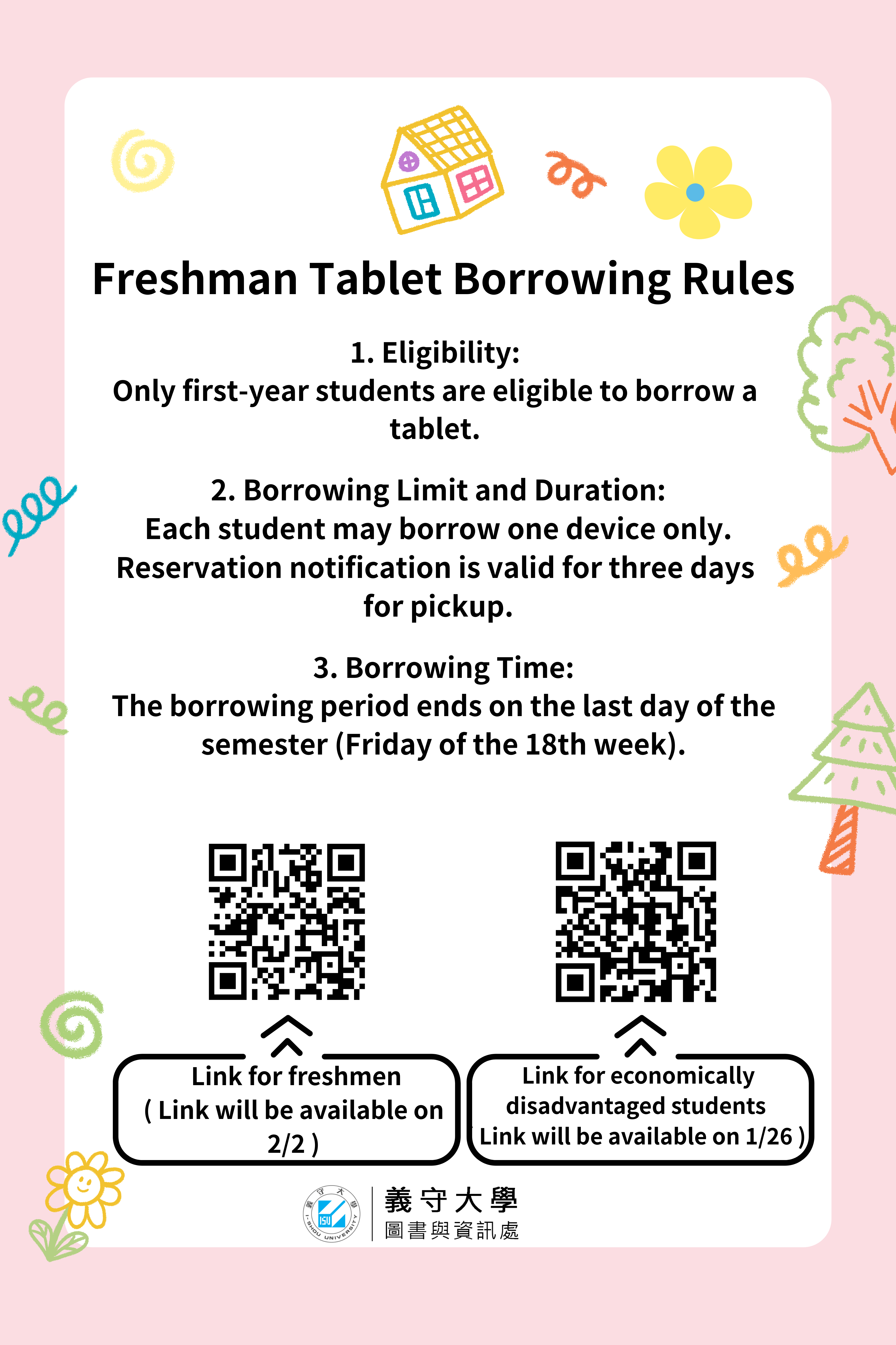 更多相關規定請參照 「義守大學圖書與資訊處平板電腦借用規則」